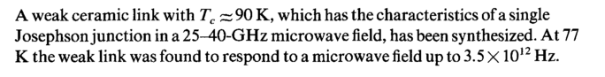 A weak ceramic link with Tc ~ 90 K, which has the characteristics of a single Josephson junction in a 25^4-O-GHz microwave field, has been synthesized. At 77 К the weak link was found to respond to a microwave field up to 3.5 Χ 1012 Hz.