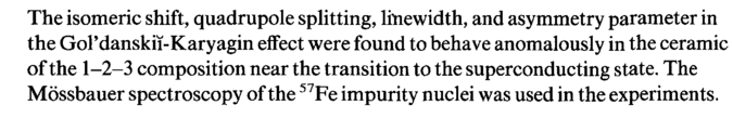 The isomeric shift, quadrupole splitting, linewidth, and asymmetry parameter in the GoPdanskii-Karyagin effect were found to behave anomalously in the ceramic of the 1-2-3 composition near the transition to the superconducting state. The Mossbauer spectroscopy of the 57Fe impurity nuclei was used in the experiments.
