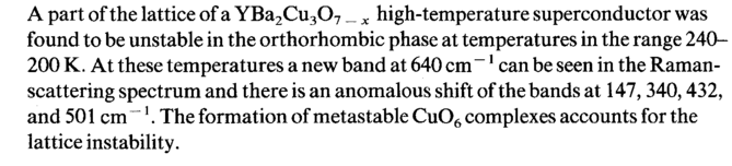 A part of the lattice of a YBa2Cu307 _ x high-temperature superconductor was found to be unstable in the orthorhombic phase at temperatures in the range 240-200 K. At these temperatures a new band at 640 cm -1 can be seen in the Raman-scattering spectrum and there is an anomalous shift of the bands at 147, 340,432, and 501 cm ~1. The formation of metastable Cu06 complexes accounts for the lattice instability.