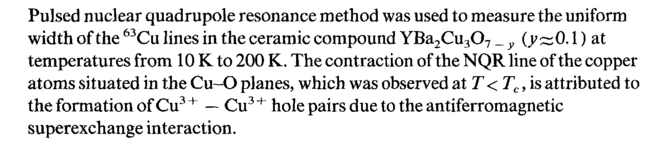 Pulsed nuclear quadrupole resonance method was used to measure the uniform width of the 63Cu lines in the ceramic compound YBa2Cu307 _ y {y^O. 1) at temperatures from 10 К to 200 K. The contraction of the NQR line of the copper atoms situated in the Cu-O planes, which was observed at T< Tc, is attributed to the formation of Си3 + — Cu3+ hole pairs due to the antiferromagnetic superexchange interaction.
