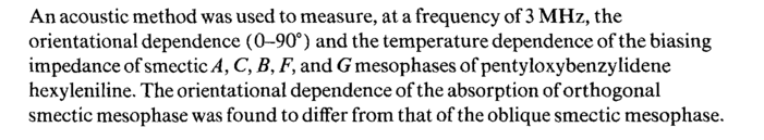 An acoustic method was used to measure, at a frequency of 3 MHz, the orientational dependence (0-90°) and the temperature dependence of the biasing impedance of smectic Л, С, B, F, and G mesophases of pentyloxybenzylidene hexyleniline. The orientational dependence of the absorption of orthogonal smectic mesophase was found to differ from that of the oblique smectic mesophase.