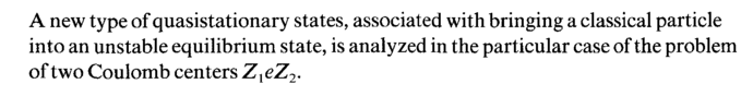 A new type of quasistationary states, associated with bringing a classical particle into an unstable equilibrium state, is analyzed in the particular case of the problem of two Coulomb centers Z1eZ2.
