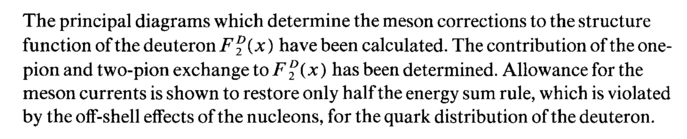 The principal diagrams which determine the meson corrections to the structure function of the deuteron Ff(x) have been calculated. The contribution of the one-pion and two-pion exchange toF%(x) has been determined. Allowance for the meson currents is shown to restore only half the energy sum rule, which is violated by the oif-shell effects of the nucleons, for the quark distribution of the deuteron.