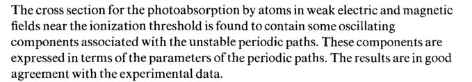 The cross section for the photoabsorption by atoms in weak electric and magnetic fields near the ionization threshold is found to contain some oscillating components associated with the unstable periodic paths. These components are expressed in terms of the parameters of the periodic paths. The results are in good agreement with the experimental data.