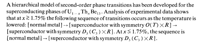 A hierarchical model of second-order phase transitions has been developed for the superconducting phases of U,xThx BeJ3. Analysis of experimental data shows that at χ δ 1.75 % the following sequence of transitions occurs as the temperature is lowered: [normal metal] -> [superconductor with symmetry O(T) XR] -> [superconductor with symmetry Z>3 (C3)XR], AtxS 1.75%, the sequence is [ normal metal ] -> [ superconductor with symmetry D3 (C3) X R ].
