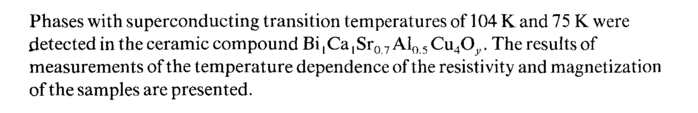 Phases with superconducting transition temperatures of 104 К and 75 К were detected in the ceramic compound Bi,Ca,Sr0 7 Al0>5 Cu4Oy. The results of measurements of the temperature dependence of the resistivity and magnetization of the samples are presented.