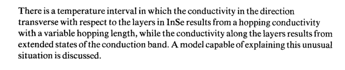 There is a temperature interval in which the conductivity in the direction transverse with respect to the layers in InSe results from a hopping conductivity with a variable hopping length, while the conductivity along the layers results from extended states of the conduction band. A model capable of explaining this unusual situation is discussed.