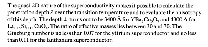 The quasi-2D nature of the superconductivity makes it possible to calculate the penetration depth Л near the transition temperature and to evaluate the anisotropy of this depth. The depth λ turns out to be 3400 A for YBa2Cu307 and 4300 A for La! 85 Sr015 Cu04. The ratio of effective masses lies between 30 and 70. The Ginzburg number is no less than 0.07 for the yttrium superconductor and no less than 0.11 for the lanthanum superconductor.