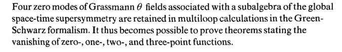 Four zero modes of Grassmann θ fields associated with a subalgebra of the global space-time supersymmetry are retained in multiloop calculations in the Green-Schwarz formalism. It thus becomes possible to prove theorems stating the vanishing of zero-, one-, two-, and three-point functions.