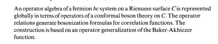 An operator algebra of a fermion be system on a Riemann surface С is represented globally in terms of operators of a conformal boson theory on C. The operator relations generate bosonization formulas for correlation functions. The construction is based on an operator generalization of the Baker-Akhiezer function.