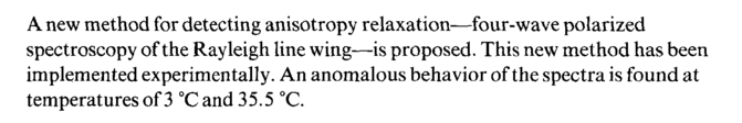A new method for detecting anisotropy relaxation—four-wave polarized spectroscopy of the Rayleigh line wing—is proposed. This new method has been implemented experimentally. An anomalous behavior of the spectra is found at temperatures of 3 °Cand 35.5 °C.