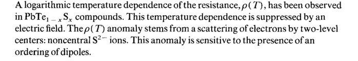 A logarithmic temperature dependence of the resistance,/? (Τ), has been observed in PbTej _ x Sx compounds. This temperature dependence is suppressed by an electric field. The/?( T) anomaly stems from a scattering of electrons by two-level centers: noncentral S2~~ ions. This anomaly is sensitive to the presence of an ordering of dipoles.
