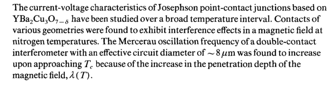 The current-voltage characteristics of Josephson point-contact junctions based on YBa2Cu307_(5 have been studied over a broad temperature interval. Contacts of various geometries were found to exhibit interference effects in a magnetic field at nitrogen temperatures. The Mercerau oscillation frequency of a double-contact interferometer with an effective circuit diameter of ~ 8 μπ\ was found to increase upon approaching Tc because of the increase in the penetration depth of the magnetic field, λ (Τ).