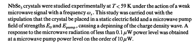 NbSe3 crystals were studied experimentally at T< 59 К under the action of a weak microwave signal with a frequency a>s. This study was carried out with the stipulation that the crystal be placed in a static electric field and a microwave pump field of strengths E0 and Epump, causing a depinning of the charge density wave. A response to the microwave radiation of less than 0.1 //W power level was obtained at a microwave pump power level on the order of 10 μ W.