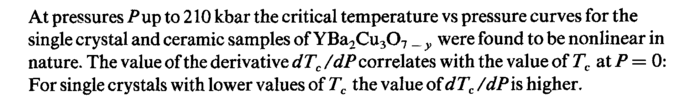 At pressures Pup to 210 kbar the critical temperature vs pressure curves for the single crystal and ceramic samples of YBa2Cu307 _ y were found to be nonlinear in nature. The value of the derivative dTc /dP correlates with the value of Tc at Ρ = 0: For single crystals with lower values of Tc the value of dTc /dPi& higher.