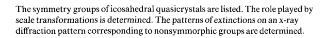 The symmetry groups of icosahedral quasicrystals are listed. The role played by scale transformations is determined. The patterns of extinctions on an x-ray diffraction pattern corresponding to nonsymmorphic groups are determined.