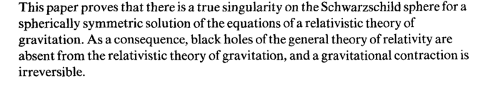 This paper proves that there is a true singularity on the Schwarzschild sphere for a spherically symmetric solution of the equations of a relativistic theory of gravitation. As a consequence, black holes of the general theory of relativity are absent from the relativistic theory of gravitation, and a gravitational contraction is irreversible.