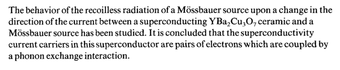 The behavior of the recoilless radiation of a Mossbauer source upon a change in the direction of the current between a superconducting YBa2Cu307 ceramic and a Mossbauer source has been studied. It is concluded that the superconductivity current carriers in this superconductor are pairs of electrons which are coupled by a phonon exchange interaction.