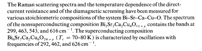 The Raman scattering spectra and the temperature dependence of the direct-current resistance and of the diamagnetic screening have been measured for various stoichiometric compositions of the system Bi-Sr-Ca-Cu-O. The spectrum of the nonsuperconducting composition Bi2Sr2Ca2Cu40|, +y contains the bands at 299,463,543, and 616cm~'. The superconducting composition Bi6Sr7Ca2Cu6024+r (Tc = 70-80 К) is characterized by oscillations with frequencies of 292,462, and 626 cm-1.