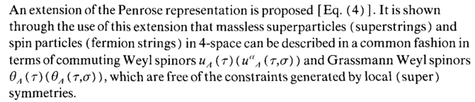 An extension of the Penrose representation is proposed [Eq. (4) ]. It is shown through the use of this extension that massless superparticles (superstrings) and spin particles (fermion strings) in 4-space can be described in a common fashion in terms of commuting Weyl spinors ÉÌ(Ô)(ÉÁá( τ,σ)) and Grassmann Weyl spinors θΑ{τ){θΑ( τ,σ)), which are free of the constraints generated by local (super) symmetries.