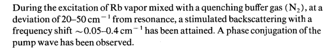 During the excitation of Rb vapor mixed with a quenching buffer gas (N2), at a deviation of20-50 cm -1 from resonance, a stimulated backscattering with a frequency shift ~ 0.05-0.4 cm-1 has been attained. A phase conjugation of the pump wave has been observed.