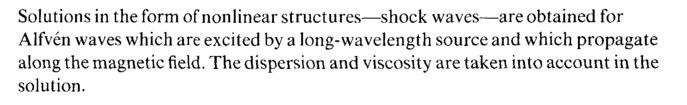 Solutions in the form of nonlinear structures—shock waves—are obtained for Alfven waves which are excited by a long-wavelength source and which propagate along the magnetic field. The dispersion and viscosity are taken into account in the solution.