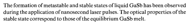 The formation of metastable and stable states of liquid GaSb has been observed during the application of nanosecond laser pulses. The optical properties of the stable state correspond to those of the equilibrium GaSb melt.