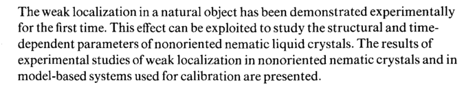 The weak localization in a natural object has been demonstrated experimentally for the first time. This effect can be exploited to study the structural and time-dependent parameters of nonoriented nematic liquid crystals. The results of experimental studies of weak localization in nonoriented nematic crystals and in model-based systems used for calibration are presented.