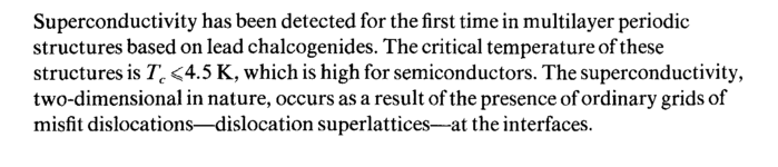 Superconductivity has been detected for the first time in multilayer periodic structures based on lead chalcogenides. The critical temperature of these structures is Tc <4.5 K, which is high for semiconductors. The superconductivity, two-dimensional in nature, occurs as a result of the presence of ordinary grids of misfit dislocations—dislocation superlattices—at the interfaces.