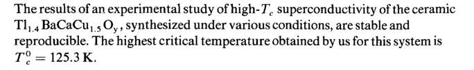 The results of an experimental study of high-Tc superconductivity of the ceramic Tlj 4 BaCaCuLS Oy, synthesized under various conditions, are stable and reproducible. The highest critical temperature obtained by us for this system is T°c = 125.3 K.