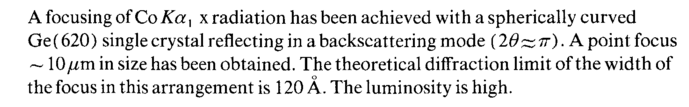 A focusing of CoKax χ radiation has been achieved with a spherically curved Ge (620) single crystal reflecting in a backscattering mode (20 ~ π). A point focus ~ 10//m in size has been obtained. The theoretical diffraction limit of the width of о _ the focus in this arrangement is 120 A. The luminosity is high.