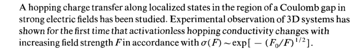 A hopping charge transfer along localized states in the region of a Coulomb gap in strong electric fields has been studied. Experimental observation of 3D systems has shown for the first time that activationless hopping conductivity changes with increasing field strength Fin accordance with a(F) ~exp[ — (F0/F)l/2].