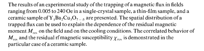 The results of an experimental study of the trapping of a magnetic flux in fields ranging from 0.005 to 240 Oe in a single-crystal sample, a thin-film sample, and a ceramic sample of Y ,Ba2Cu307 _ δ are presented. The spatial distribution of a trapped flux can be used to explain the dependence of the residual magnetic moment Mres on the field and on the cooling conditions. The correlated behavior of Afres and the residual rf magnetic susceptibility jrcs is demonstrated in the particular case of a ceramic sample.