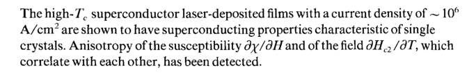 The highTc superconductor laser-deposited films with a current density of ~ 106 A/cm2 are shown to have superconducting properties characteristic of single crystals. Anisotropy of the susceptibility δχ/dHmd of the field ÄîÓ1/Äô, which correlate with each other, has been detected.