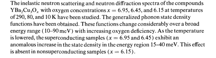 The inelastic neutron scattering and neutron diffraction spectra of the compounds YBa2Cu3Ox with oxygen concentrations χ = 6.95, 6.45, and 6.15 at temperatures of290,80, and 10 К have been studied. The generalized phonon state density functions have been obtained. These functions change considerably over a broad energy range (10-90 meV) with increasing oxygen deficiency. As the temperature is lowered, the superconducting samples (x = 6.95 and 6.45) exhibit an anomalous increase in the state density in the energy region 15-40 meV. This effect is absent in nonsuperconducting samples (x = 6.15).