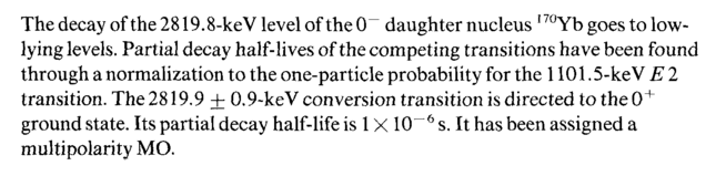 The decay of the 2819.8-keV level of the 0~ daughter nucleus 170Yb goes to low-lying levels. Partial decay half-lives of the competing transitions have been found through a normalization to the one-particle probability for the 1101.5-keV Ε 2 transition. The 2819,9 + 0.9-keV conversion transition is directed to the0+ ground state. Its partial decay half-life is 1X 10"6 s. It has been assigned a multipolarity MO.