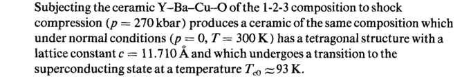 Subjecting the ceramic Y-Ba-Cu-O of the 1-2-3 composition to shock compression (p — 270 kbar) produces a ceramic of the same composition which under normal conditions (ρ = 0, Τ = 300 К) has a tetragonal structure with a о lattice constant с = 11.710 A and which undergoes a transition to the superconducting state at a temperature 93 K.