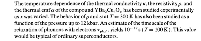 The temperature dependence of the thermal conductivity к, the resistivity p, and the thermal emf a of the compound YBa2Cu30has been studied experimentally as χ was varied. The behavior of ρ and a at Τ = 300 К has also been studied as a function of the pressure up to 12 kbar. An estimate of the time scale of the relaxation of phonons with electrons rphe,, yields 10~12 s (Г = 100 K). This value would be typical of ordinary superconduct ors.