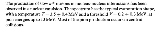 The production of slow 77 ± mesons in nucleus-nucleus interactions has been observed in a nuclear emulsion. The spectrum has the typical evaporation shape, with a temperature T~ 3.5 + 0.4 MeV and a threshold V~ 0.2 + 0.3 MeV, at pion energies up to 13 MeV. Most of the pion production occurs in central collisions.