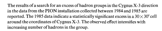 The results of a search for an excess of hadron groups in the Cygnus X-3 direction in the data from the PION installation collected between 1984 and 1985 are reported. The 1985 data indicate a statistically significant excess in a 30 X 30° cell around the coordinates of Cygnus X-3. The observed effect intensifies with increasing number of hadrons in the group.