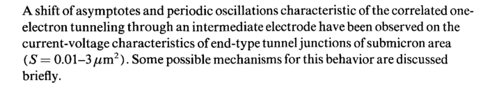 A shift of asymptotes and periodic oscillations characteristic of the correlated one-electron tunneling through an intermediate electrode have been observed on the current-voltage characteristics of end-type tunnel junctions of submicron area (S = 0.01-3μτη2). Some possible mechanisms for this behavior are discussed briefly.