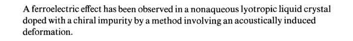 A ferroelectric eifect has been observed in a nonaqueous lyotropic liquid crystal doped with a chiral impurity by a method involving an acoustically induced deformation.