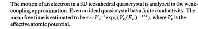 The motion of an electron in a 3D icosahedral quasicrystal is analyzed in the weak-coupling approximation. Even an ideal quasicrystal has a finite conductivity. The mean free time is estimated to be r~ VQ1exp((V0/EF)~1/4), where F0is the effective atomic potential.