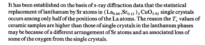 It has been established on the basis of x-ray diffraction data that the statistical replacement of lanthanum by Sr atoms in (La08g ,Sroi2 )2 Cu03 92 single crystals occurs among only half of the positions of the La atoms. The reason the Tc values of ceramic samples are higher than those of single crystals in the lanthanum phases may be because of a different arrangement of Sr atoms and an associated loss of some of the oxygen from the single crystals.