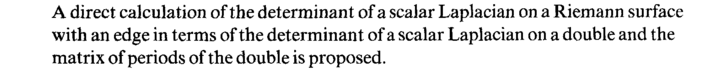 A direct calculation of the determinant of a scalar Laplacian on a Riemann surface with an edge in terms of the determinant of a scalar Laplacian on a double and the matrix of periods of the double is proposed.