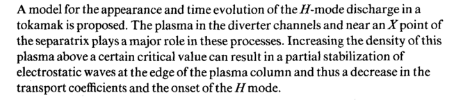 A model for the appearance and time evolution of the Η-mode discharge in a tokamak is proposed. The plasma in the diverier channels and near an Xpoint of the separatrix plays a major role in these processes. Increasing the density of this plasma above a certain critical value can result in a partial stabilization of electrostatic waves at the edge of the plasma column and thus a decrease in the transport coefficients and the onset of the i/mode.