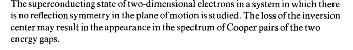 The superconducting state of two-dimensional electrons in a system in which there is no reflection symmetry in the plane of motion is studied. The loss of the inversion center may result in the appearance in the spectrum of Cooper pairs of the two energy gaps.
