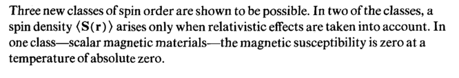 Three new classes of spin order are shown to be possible. In two of the classes, a spin density (S(r)) arises only when relativistic effects are taken into account. In one class—scalar magnetic materials—the magnetic susceptibility is zero at a temperature of absolute zero.