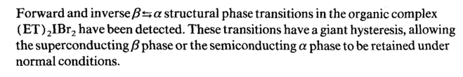 Forward and inverse β ±* a structural phase transitions in the organic complex (ET) 2IBr2 have been detected. These transitions have a giant hysteresis, allowing the superconducting β phase or the semiconducting a phase to be retained under normal conditions.