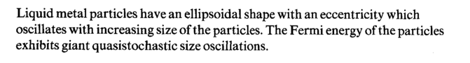 Liquid metal particles have an ellipsoidal shape with an eccentricity which oscillates with increasing size of the particles. The Fermi energy of the particles exhibits giant quasistochastic size oscillations.
